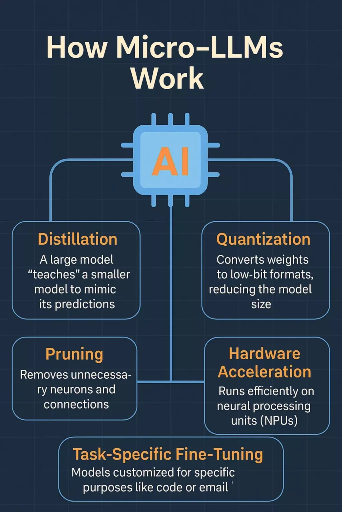 Micro-LLMs rely on a combination of clever engineering techniques that make them lighter and faster without drastically compromising capability.